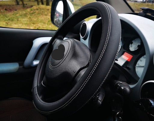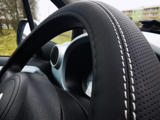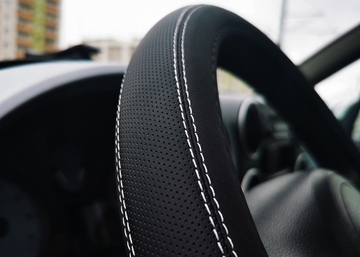 Pokrowiec na kierownicę wykonany z wysokiej jakości ekoskóry perforowanej połączonej z ekoskórą gładką (czarny mat).