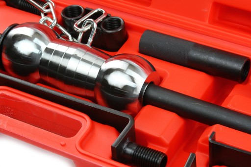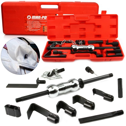 W zestawie znajdują się różnego rodzaju chwytaki, pobijaki, haczyki do wyciągania i usuwania wgnieceń.