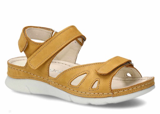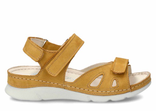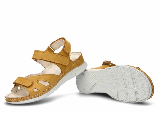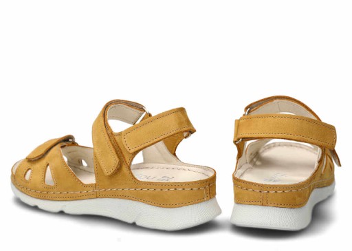 Sandał damski Nagaba 102 w kolorze głębokiej żółci został wykonany z najwyższej jakości skóry naturalnej nubukowej typu samuel. Dzięki temu obuwie zachwyca nie tylko estetycznością wykonania, ale i świetnymi właściwościami. Zastosowanie komponentów ze skóry pochodzenia naturalnego pozwoliło nam stworzyć buty, które nie mają negatywnego wpływu na stopy. Nie powodują również otarć oraz podrażnień. Oprócz tego skóra naturalna charakteryzuje się świetną elastycznością. Dzięki temu sandał damski Nagaba 102 żółty samuel skórzany idealnie dopasowuje się do kształtu stopy. Warto wspomnieć również o trzech paskach na rzepy, ułatwiających idealne dopasowanie butów do stopy.