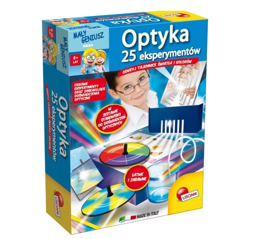 Kompletny zestaw, dzięki któremu poznasz podstawowe zagadnienia z optyki i oswoisz się z metodą naukową jaką jest eksperyment! Opakowanie zawiera niezbędne materiały, dzięki którym dowiesz się, w jaki sposób powstaje tęcza, poznasz tajemnice refrakcji, skutki rozbicia światła i wiele innych rzeczy! A dzięki specjalnemu stolikowi doświadczalnemu przeprowadzanie eksperymentów będzie dziecinnie proste! Dodatkowo w zestawie znajdziesz puzzle Newtona oraz ilustrowany podręcznik wyjaśniający krok po kroku, jak przeprowadzić 25 eksperymentów.