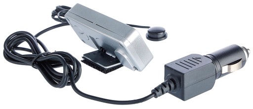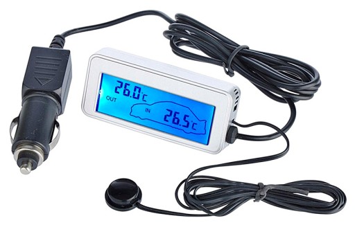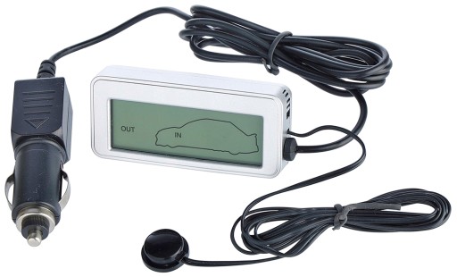 Elektroniczny termometr samochodowy z wyświetlaczem LCD. Umożliwia dokonywanie pomiaru temperatury zewnętrznej i wewnętrznej poprzez dwa niezależne czujniki temperatury. Zasilany z gniazda zapalniczki.