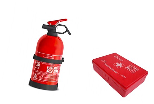 Apteczka samochodowa: (6 pozycji): bandaż elastyczny (2szt, 4mmx6cm i 4mmx8cm), kompres gazowy-1szt, plaster z opatrunkiem-1szt, rękawice winylowe- 1 para, instrukcja udzielania pierwszej pomocy.