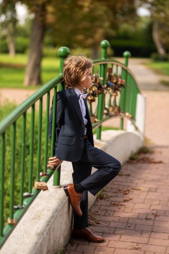 Garnitur komunijny uszyty jest z gładkiej, klasycznej tkaniny garniturowej w kolorze granatowym.