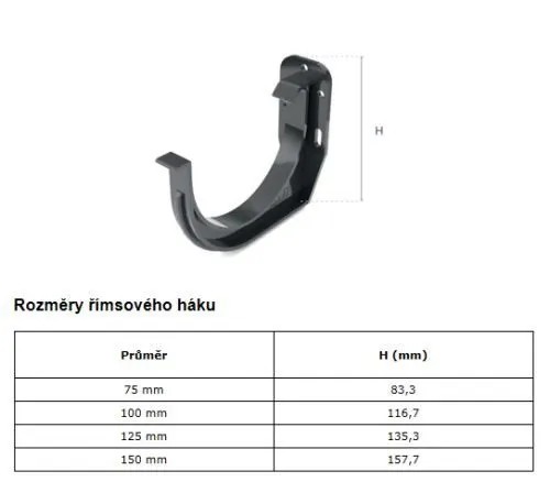 Wymiary haka gzymsowego Średnica H (mm) Szerokość (mm) 75 mm 83,3 45 100 mm 116,7 45 125 mm 135,3 50 150 mm 157,7 50