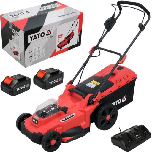 Kosiarka akumulatorowa marki YATO, o podwójnej mocy systemowych akumulatorów 2x18 V wynoszącej 36 V, zapewnia cichą i wygodną pielęgnację trawników.