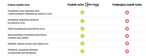 - Innowacyjne rozwiązanie w ofercie Spectrum SMART, dzięki któremu Twoje oświetlenie lub inne urządzenia podłączone za pomocą kabla lub Wi-Fi, po wykryciu ruchu, mogą się samoczynnie uruchamiać o zaplanowanej porze(czujnik działa również bez dostępu do sieci Wi-Fi)