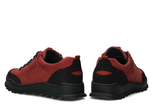 Prezentowane przez nas półbuty trekkingowe skórzane 0521 w kolorze czerwonym zostały wykonane z solidnych komponentów z Polski oraz zagranicy. Są to: ciemna podeszwa, ciemny element materiału na czubku i tylniku buta, a także kolorowa skóra naturalna typu Crazy (jako materiał wierzchni, podszewka oraz wyściółka obuwia). Za jej sprawą idealnie dopasowuje się do kształtu stopy, zapewnia odpowiednie właściwości higieniczne i przekłada się na podwyższone poczucie komfortu. Miłośnikom pieszych wycieczek z pewnością spodoba się dodatkowy atut, jakim jest traperowaty charakter bieżnika zapewniający dobrą przyczepność do różnych terenów.