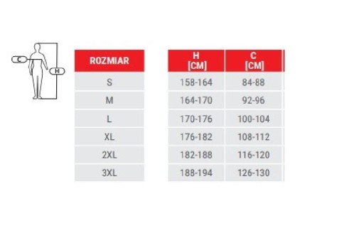 - Rozmiar należy dobrać wymiarów klatki piersiowej i wzrostu