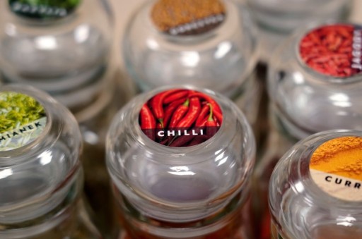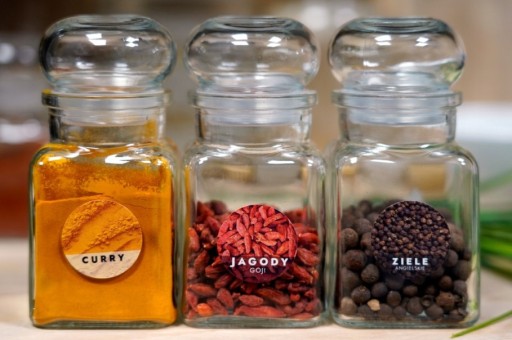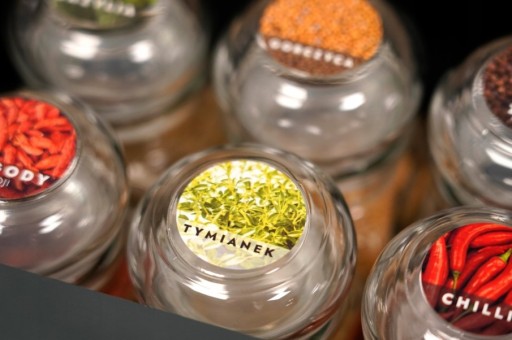 W zestawie znajduje się 160 już zadrukowanych naklejek z nazwami większości przypraw.