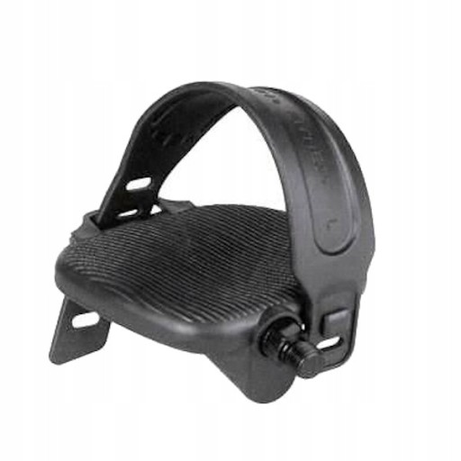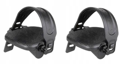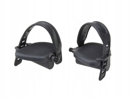 Komplet pedałów do roweru stacjonarnego. Pedały mają regulowane paski przytrzymujące buty. Obciążnik pod spodem każdego pedału ustawia go zawsze w pozycji umożliwiającej wsunięcie buta.