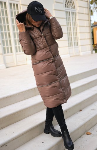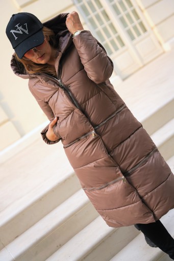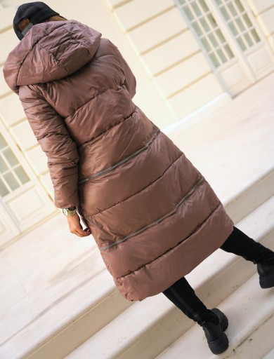 DŁUGI PŁASZCZ ZIMOWY PIKOWANY KAWOWY Z KAPUTREM;