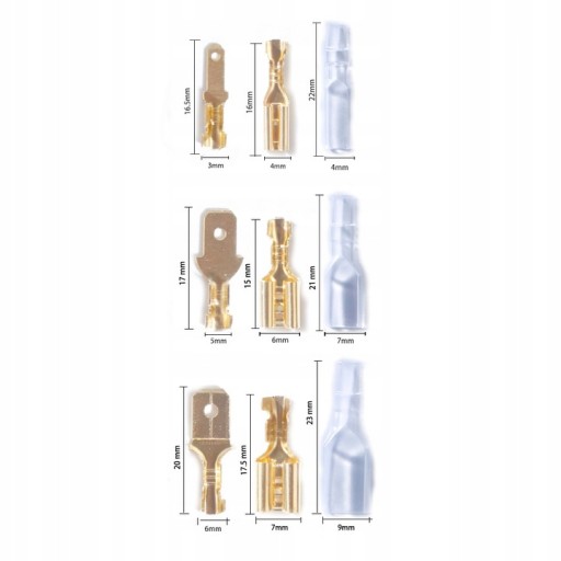 Zestaw konektorów samochodowych składa się z różnych typów konektorów, aby sprostać różnym wymaganiom. Posiadamy konektory typu 2,8 mm, 4,8 mm i 6,3 mm, które różnią się grubością i kompatybilnym przewodem. Zapewniają one wszechstronność podczas podłączania przewodów o różnych rozmiarach.