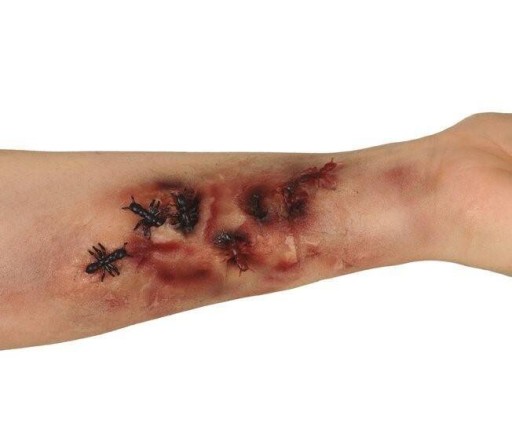Rana przedstawia skaleczenie, z którego wychodzą mrówki.