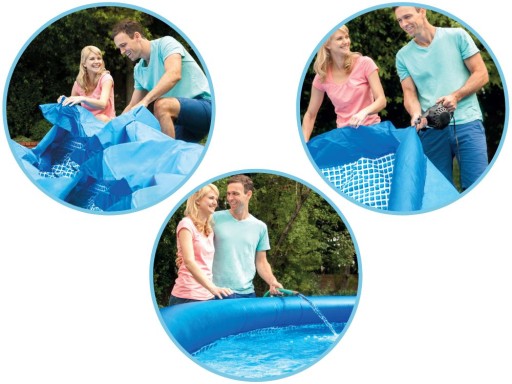 Baseny z serii Easy Set są niezwykle łatwe w montażu, utrzymaniu i przyjemne w posiadaniu. Wystarczy rozłożyć je na poziomym podłożu, napompować górny pierścień, napełnić wodą i cieszyć się zabawą. Dzięki specjalnej opatentowanej technologii produkcji winylu SUPER-TOUGH są niezwykle wytrzymałe, co pozwala cieszyć się basenem przez wiele sezonów. Wyposażone są w korek spustowy, który można podłączyć z wężem ogrodowym - woda może być odprowadzana z dala od basenu.