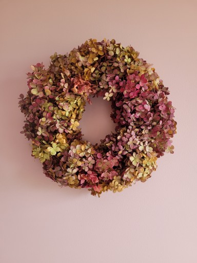 Wianek wykonany w całości z naturalnej hortensji w delikatnych jesiennych kolorach. Pleciony na słomianej obręczy.