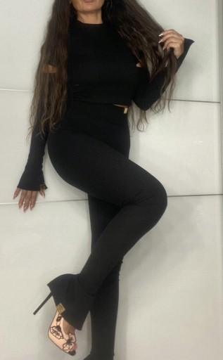 Przepiękny sweterkowy komplet Khloe składający się z legginsów z wysokim stanem oraz z bluzeczki z dekoltem V. Bluzka ozdobiona na dekolcie, rękawie oraz nogawkach złotym logo. Komplet jest idealny na codzienne wyjścia, spacery czy wyjścia ze znajomymi. Nie prześwituje. Uwaga- komplet wypada mniejszy- Rozmiar S z metki wypada na XS, S.