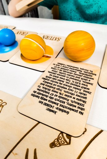 - 8 drewnianych kart z nazwą planety, zdjęciem i opisem na odwrocie