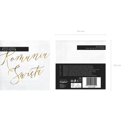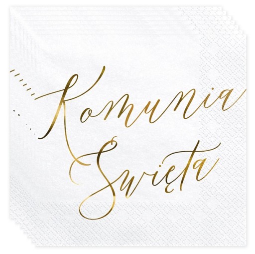 Białe serwetki papierowe ze złotym napisem Komunia Święta.