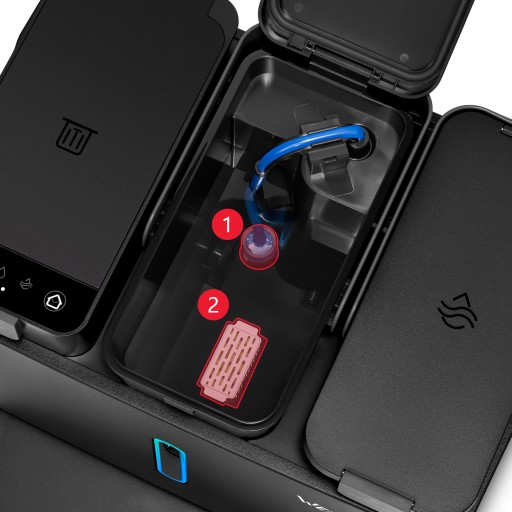 - ✔️ Sterylizacja wody - zbiornik czystej wody jest wyposażony w nanomolekularny sterylizator 2️⃣ i filtr gąbkowy 1️⃣, które na bieżąco dezynfekują wodę.