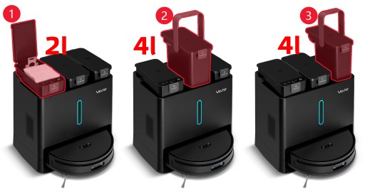 - ✔️ Odsysanie zbiornika zanieczyszczeń 1️⃣ - zawartość 300 ml pojemnika na kurz robota jest automatycznie opróżniania do worka na zanieczyszczenia o pojemności 2 l. Moc odsysania wynosi aż 21000 Pa. Można zarządzać częstotliwością opróżniania w aplikacji.