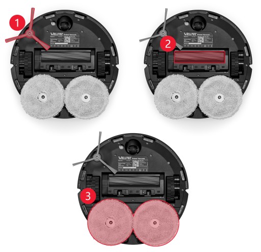 ✅ Robot podczas sprzątania porusza się w sposób logiczny - od krawędzi pomieszczenia do jego środka. Szczotka boczna 1️⃣o długim włosiu wymiata zanieczyszczenia z brzegu pod nadjeżdżającego robota, a te przy pomocy silikonowej szczotki głównej 2️⃣ zapobiegającej splątaniu włosów są zasysane do zbiornika. Następnie, umiejscowiony w tylnej części maszyny moduł mopujący dozuje wodę na obrotowe ściereczki 3️⃣ i dokładnie myje podłogę.