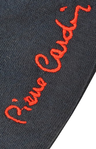 Z boku na nogawce logo producenta w postaci haftowanego napisu Pierre Cardin w kolorze czerwonym.