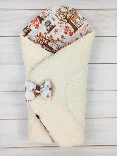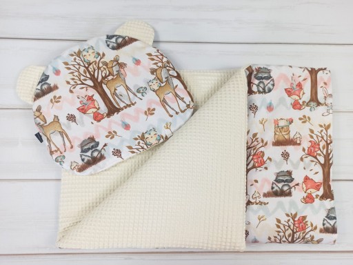 Rożek jest dwustronny - z jednej strony delikatny materiał (bawełna) wafel, z drugiej strony bawełna z przepięknym wzorem. Rożek można obrócić na drugą stronę, tak aby wzór był na zewnętrznej stronie a delikatny wafel wewnątrz.