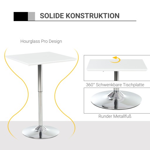 · Kolor: biały; · Materiał: płyta MDF, stal; · Całkowite wymiary: szer. 60 x gł. 60 x wys. 71-92 cm; · Grubość stołu: 2,5 cm; · Rozmiar podstawy: Ø 45 cm; · Maks. obciążenie: 60 kg;