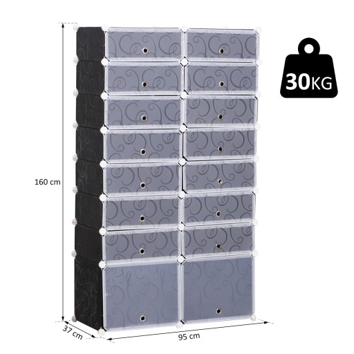 · Materiał: tworzywo sztuczne (PP, ABS), metal;· Kolor: czarny + biały;· Całkowite wymiary: szer. 95 x głęb. 37 x wys. 160 cm;· Wymiary małej komory (x 14): szer. 45 x głęb. 35 x wys. 17 cm;· Wymiary dużego przedziału (x 2): W45 x D35 x H35cm;· Maks. obciążenie: 30 kg;· Waga: 11,5 kg;