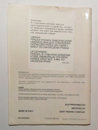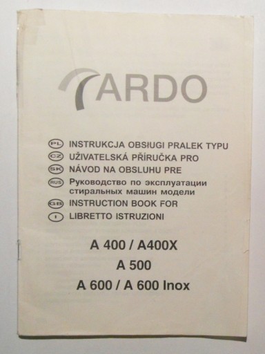 Sprzedaję instrukcję obsługi pralek Ardo typu A 400 / A400X, A 500, A 600 / A 600 Inox. Rok wydania 1999. Made in Italy. 84 strony + okładka. Stan dobry (normalne ślady używania). Zapraszam na inne moje aukcje.