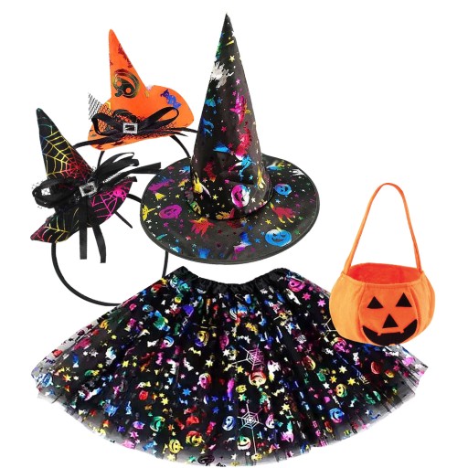 Zestaw składa się z spódniczki tutu 2- warstwowej, opaski czarnej, koszyczka na cukierki, kapelusza czarodzieja, opaski pomarańczowej.
