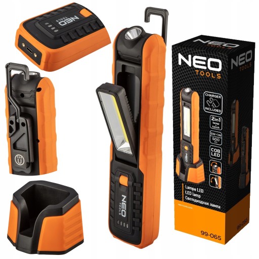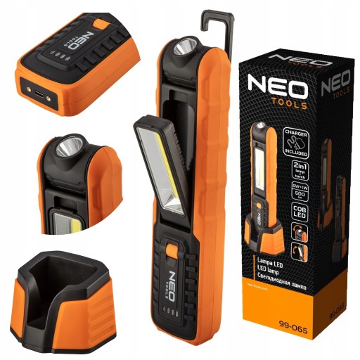 Lampa warsztatowa akumulatorowa NEO (nr ref 99-065) wyposażona jest w diodę LED COB o strumieniu świetlnym 500 lumenów oraz mocy 5W + 1W. Może być używana zarówno jako latarka oraz jako lampa dzięki ruchomej głowicy. Zasilana jest dołączonym do zestawu akumulatorem 3.7V Li-Ion o pojemności 2600 mAh. Ładowanie odbywa się za pomocą bazy ładującej, która stanowi również podstawkę utrzymująca ją w pionie. Lampę można zawiesić na wbudowanym haku lub zamocować na magnes.