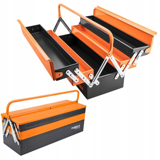 Skrzynka narzędziowa NEO (nr ref. 84-101) o wymiarch 55 x 20 x 21 cm, masa 5.0 kg, wielopoziomowa. Wykonana z solidnej blachy stalowej, która zapewnia dużą wytrzymałość skrzynki. Praktyczne komory ułatwiają przechowywanie narzędzi. Skrzynka po otwarciu rozsuwa się na dwie strony ułatwiając dostęp do narzędzi. Duży uchwyt umożliwia wygodne przenoszenie skrzynki. Niezawodność produktu potwierdza 25-letnia gwarancja. Marka NEO spełnia oczekiwania profesjonalistów.