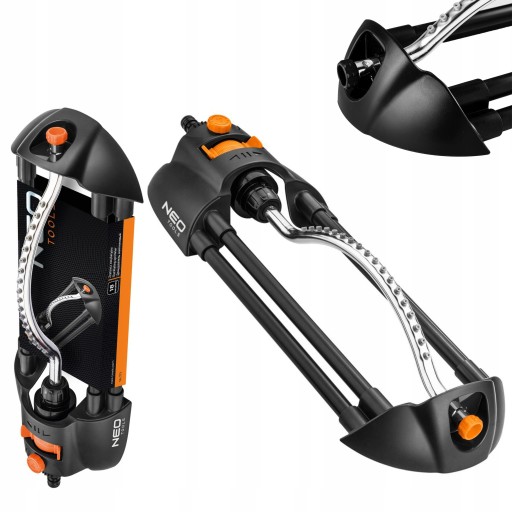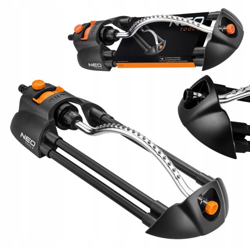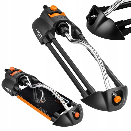 Zraszacz oscylacyjny, 15-771, NEO, przeznaczony jest do nawadniania trawników, ogrodów i upraw. Umożliwia jednoczesne podlewania roślin na powierzchni 14x19 m. Został wyposażony w 18 dysz wylotowych, umieszczonych na metalowym pałąku. Zraszacz ma suwaki, które dają możliwość ustawienia jego zakresu ruchów. Dodatkowo urządzenie ma pokrętło, które pozwala na regulację siły strumienia, co ułatwia zmianę zasięgu zraszania.