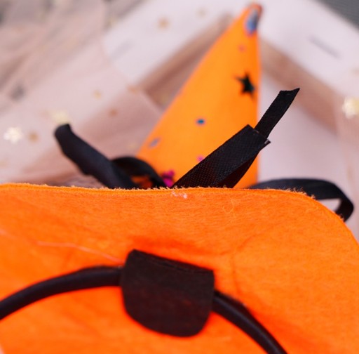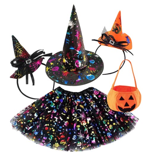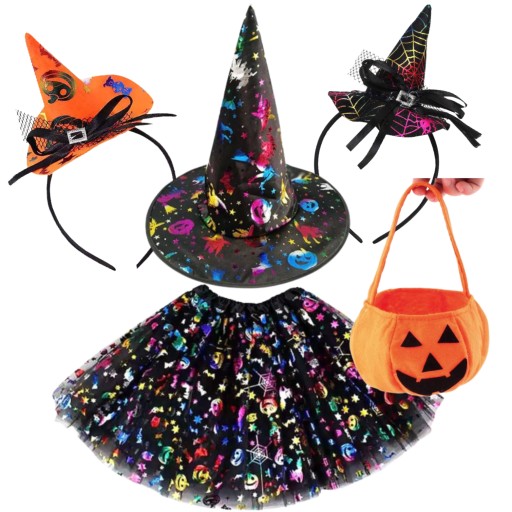 Zestaw składa się z spódniczki tutu 2- warstwowej, opaski czarnej, koszyczka na cukierki, kapelusza czarodzieja, opaski pomarańczowej.