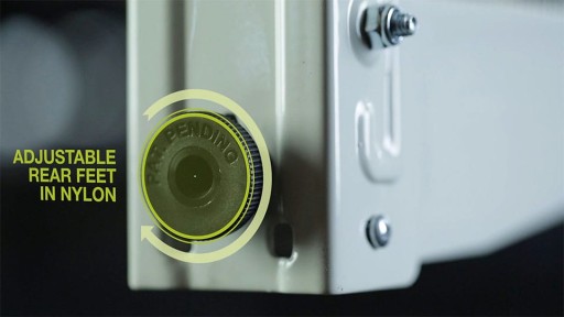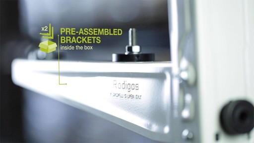 Nogi uchwytów ściennych RODIGAS posiadają możliwość regulacji pionu dzięki zastosowanym stopkom pionującym. Umożliwiają one właściwe ustawienie agregatu nawet przy nierównych podłożach. Dołączony komplet odpowiednich śrub mocujących i podkładek amortyzujących podnosi komfort pracy urządzenia tłumiąc drgania wywołane jego pracą.