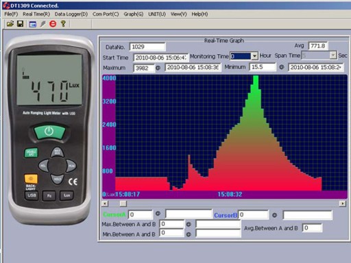 Luxometr DT-1309 jest cyfrowym miernikiem poziomu natężenia światła przeznaczonym do zastosowań w przemyśle, biurach, fotografii itp. Miernik mierzy natężenie światła w zakresie 0 - 400 klux z rozdzielczością 0.1 lux (dokładność ±5% dla pomiarów <10klux oraz ±10% dla pomiarów >10klux). Miernik posiada duży (44x58mm) 4-ro cyfrowy podświetlany wyświetlacz LCD do odczytu pomiarów, bargraf, pamięć ostatniego, minimalnego i maksymalnego odczytu, tryb wyświetlania wartości względnej oraz automatyczny wyłącznik (z możliwością dezaktywacji).