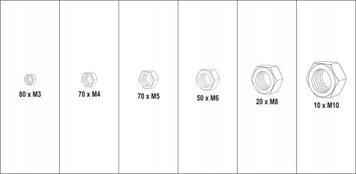Zestaw 300 sztuk nakrętek nierdzewnych metrycznych zawiera rozmiary M3, M4, M5, M6, M8, M10. Całość umieszczono w wygodnym opakowaniu typu "sortownik".
