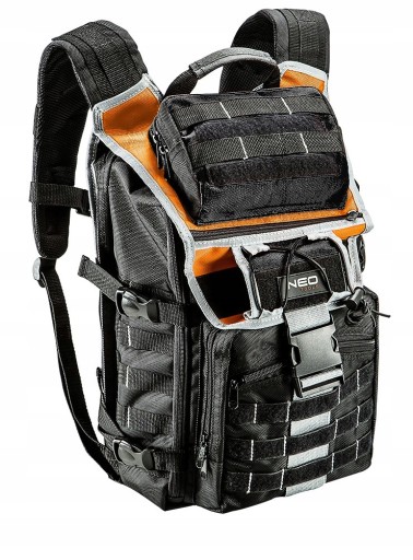 Plecak monterski NEO wykonany z trwałego poliestru 600 D, gwarantującego długoletnią trwałość torby. Plecak wyposażony jest w 4 zewnętrzne i 18 wenętrznych kieszeni na narzędzia ułatwiających przechowywanie i transport. Dla komfortu plecak posiada profilowane pasy nośne wraz z pasem piersiowym oraz oddychającymi plecami
