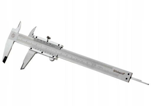 Suwmiarka analogowa, noniuszowa (pokryta matowym chromem). Umożliwia pomiary na zewnątrz i wewnątrz. Posiada głębokościomierz.