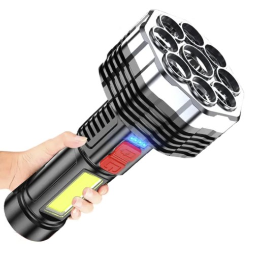 Latarka wyposażona w 9 diod led na przodzie oraz 1 diodę cob na boku urządzenia.