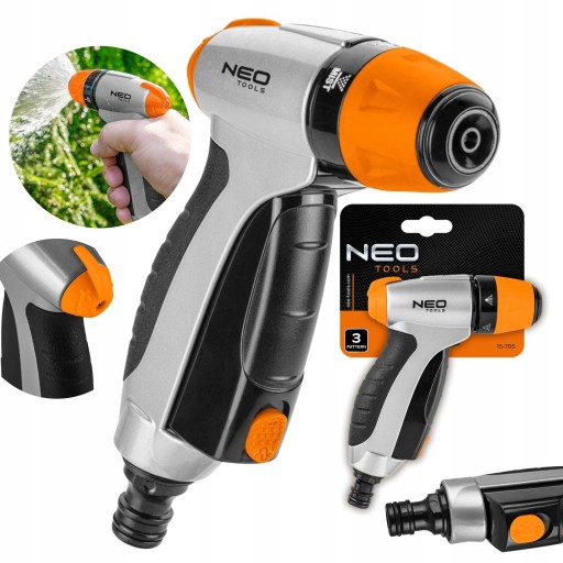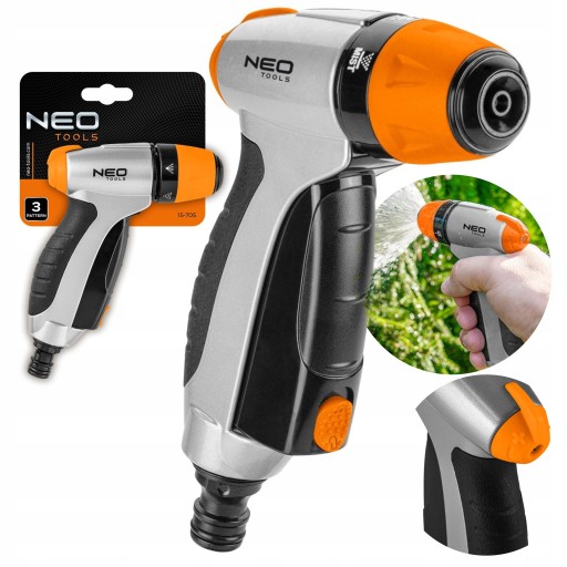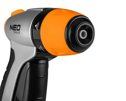 Zraszacz pistoletowy, 15-705, NEO, przeznaczony jest do nawadniania trawników, ogrodów i upraw. Wygodny zraszacz do trzymania w dłoni. Dlatego też ma ergonomiczny uchwyt, co ułatwia jego dzierżenie. Jest wyposażony w 3 funkcje podlewania, które pozwalają dopasować rodzaje strumienia do potrzeb. Ma również pokrętło do regulacji przepływu wody.