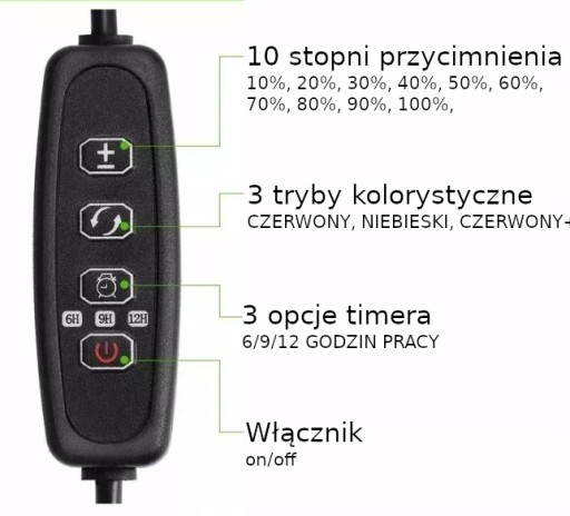 - Na kablu znajduje się również pilot sterowania z funkcjami włączenia i wyłączenia lampy, timerem, oraz 10 stopniami mocy świecenia.