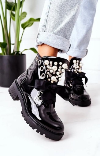 Wyjątkowe botki damskie wykonane z eko skóry Lakierowane zdobione perełkami Wnętrze ocieplone jest miłym w dotyku kocem obuwniczym. Model wyróżnia się krojem cholewki oraz ozdobami. Przy wyborze rozmiaru prosimy sugerować się tabelą rozmiarów.