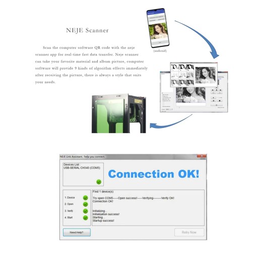 ✨Zeskanuj kod QR za pomocą aplikacji NEJE Scanner APP (obsługuje tylko wersję Androida), automatycznie połączy się z oprogramowaniem komputerowym, prostym i łatwym w użyciu.