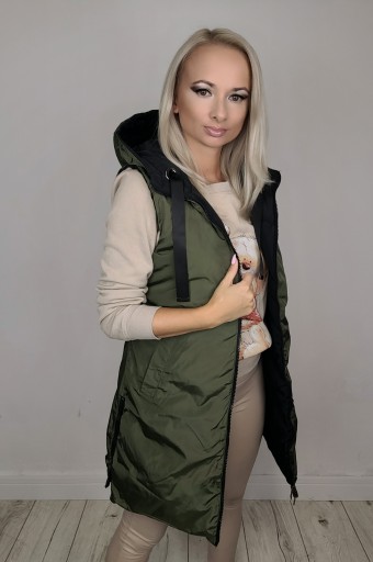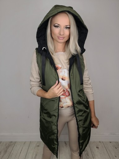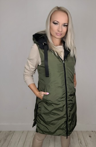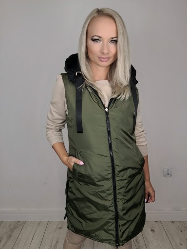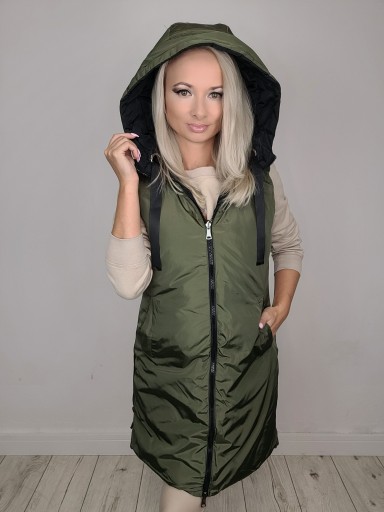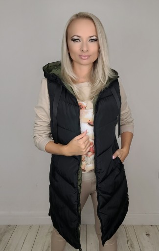 Kamizelka bezrękawnik damski pikowany z kapturem w kolorze czarnym. Kamizelka jest dwustronna dzięki czemu łatwiej jest dopasować ją do każdej stylizacji. Obszerny kaptur ochroni przed wiatrem. Boki rozpinane na zamek błyskawiczny