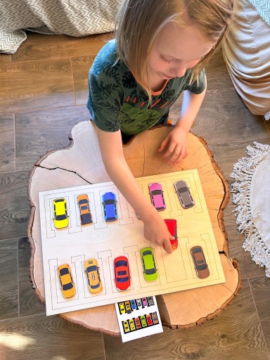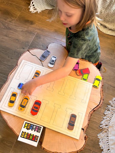 Dziecko może użyć dołączonych kart do odwzorowywania, aby ułożyć pojazdy na parkingu w odpowiedniej kolejności. To doskonały sposób na rozwijanie zdolności logicznych i myślenia przestrzennego.