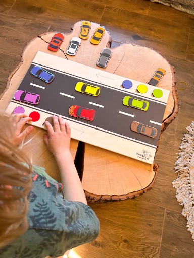 Kolejną część zestawu stanowi droga, na której dziecko umieszcza kolorowe samochody zgodnie z kropkami i strzałkami. To wspaniała okazja do nauki kolorów, liczenia samochodów i zabawy w kierowcę.