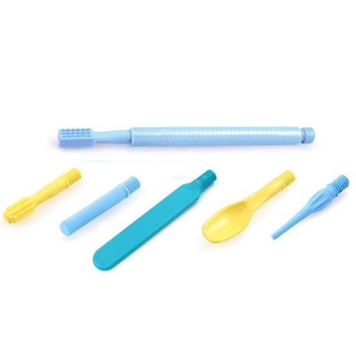 Na końcu wibratora znajduje się pokrętło służące do włączania i wyłączania wibracji. Pokrętło może być zastąpione drugą końcówką co umożliwia naprzemienne stosowanie dwóch końcówek bez potrzeby każdorazowego wymieniania ich. Na przykład użyj końcówki Fine Tip do stymulacji języka w celu odpowiedniego uformowania go w celu przyjęcia pokarmu (tzw. miseczka), po czym obróć wibrator z łyżką na drugim jego końcu w celu podania pokarmu. Rączka wibratora bez końcówki masującej ma 12 cm długości i nieco ponad 1 cm średnicy.
