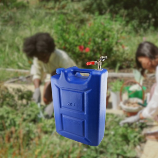 Przydatny i funkcjonalny niebieski kanister z kranikiem.
